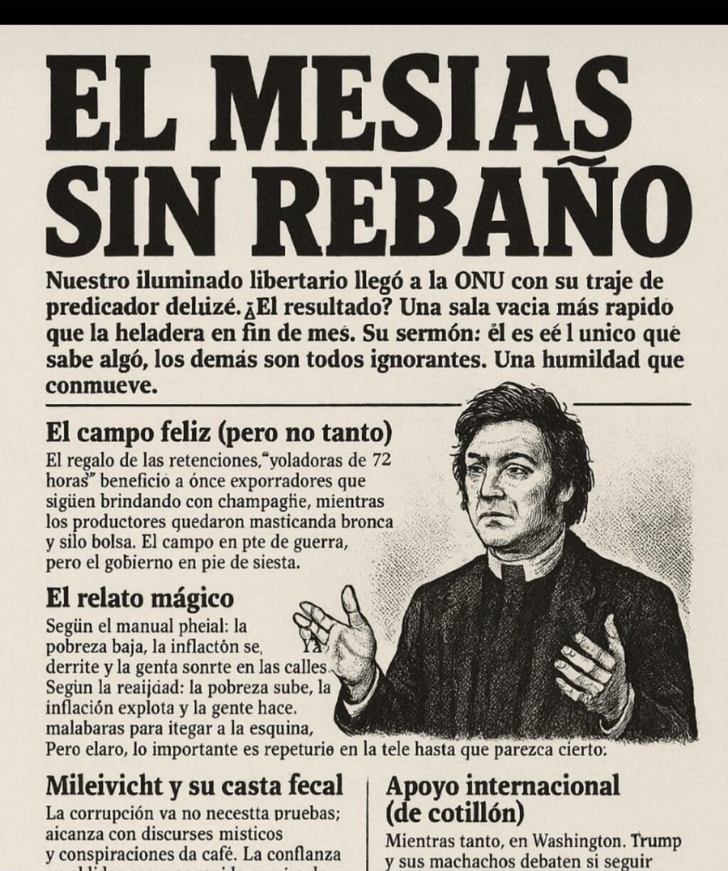 Nuestro iluminado libertario llegó a la ONU con su traje de predicador deluxe. ¿El resultado? Una sala vacía más rápido que la heladera en fin de mes. Su sermón: él es el único que sabe algo, los demás son todos ignorantes. Una humildad que conmueve.